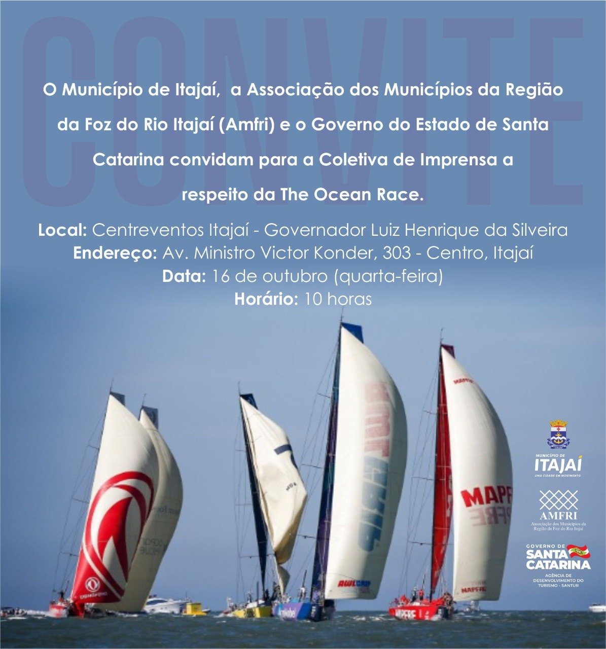 O Município de Itajaí, a Associação dos Municípios da Região da Foz do Rio Itajaí (Amfri) e o Governo do Estado de Santa Catarina convidam para coletiva de imprensa sobre a The Ocean Race.