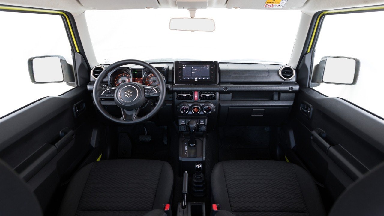 O volante em couro tem ótima empunhadura e é equipado com piloto automático, controles de áudio, piloto automático e o Speed Limiter, que facilita para andar nos grandes centros. Para um maior conforto, o Jimny Sierra vem com ar-condicionado digital automático.
