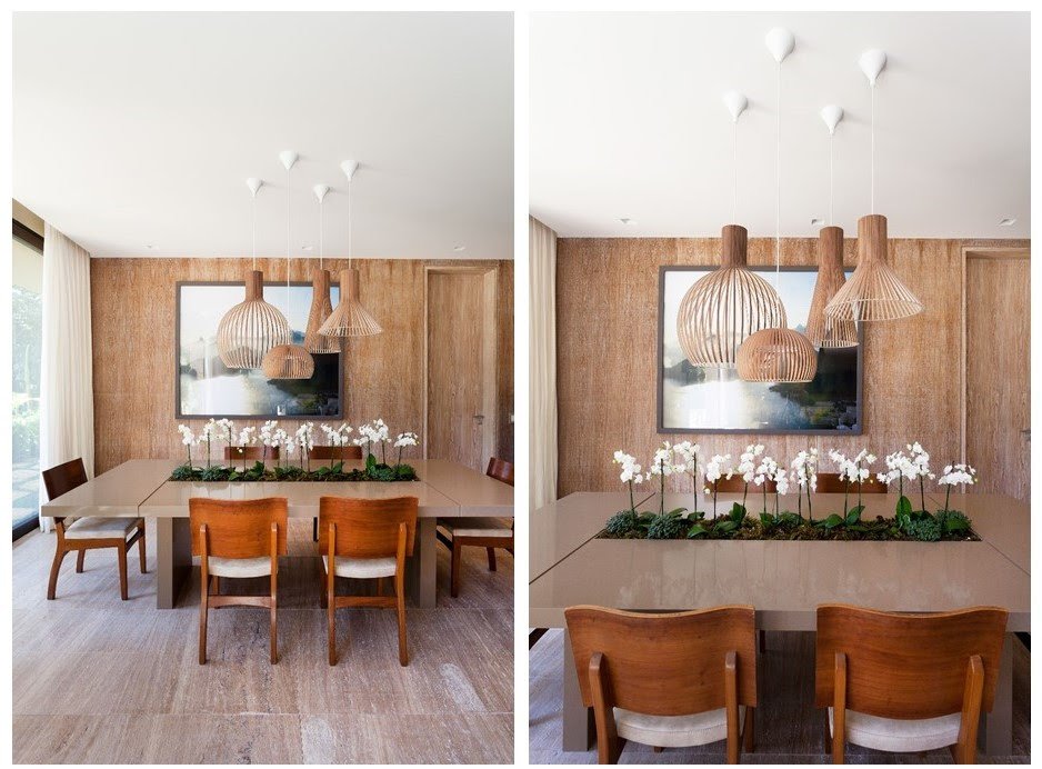 Em uma sofisticada casa de campo, a sala de jantar traz uma mesa exclusiva, desenhada pela arquiteta especialmente para compor o espaço. A ideia é trazer arranjos de flores e plantas, ou até mesmo pequenas hortas com ervas frescas, para compor a decoração.