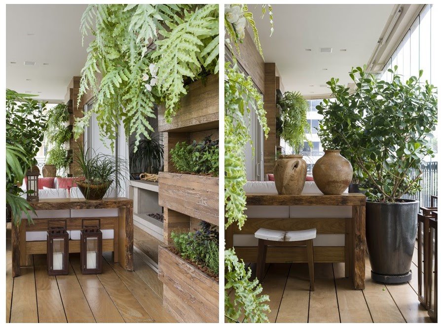 Em uma cobertura dúplex, o jardim vertical no terraço pergolado, localizado atrás da lareira do living, cobre uma extensa parede e tem um espelho d’agua com bicas d’agua. Um banco de madeira percorre toda esta extensão e reforça sua linearidade. Ao mesmo tempo uma floreira do lado oposto faz o fundo verde para o vidro da lareira do living. Este terraço-jardim conduz à área de lazer, com gourmet e piscina.
