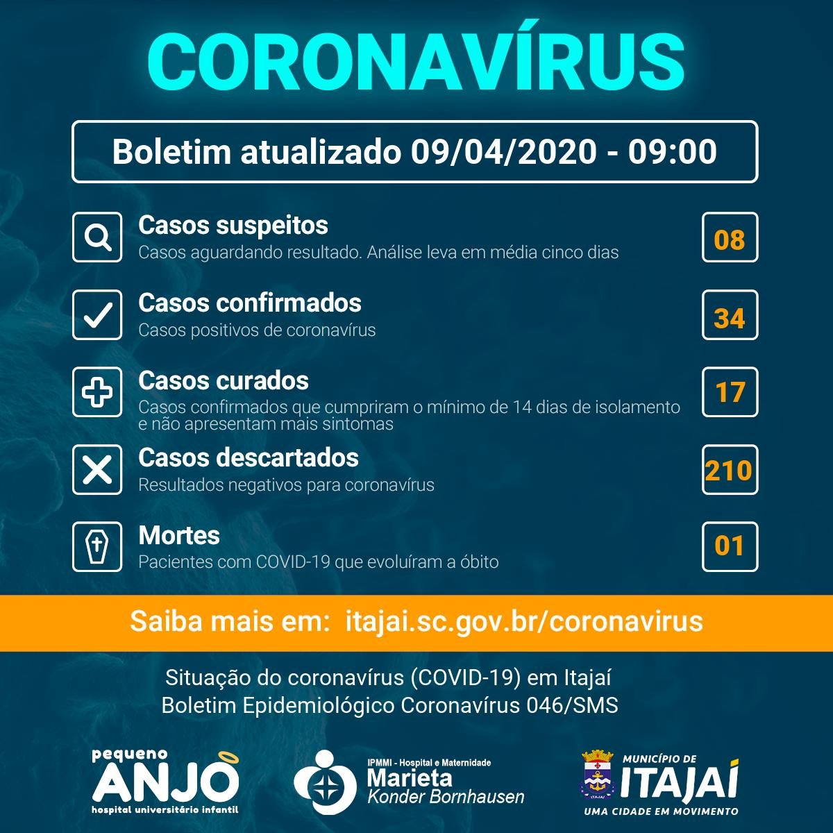 Três novos casos confirmados de coronavírus foram registrados na manhã desta quinta-feira (9) em Itajaí. Agora são 34 casos positivos da doença. Um dos confirmados é um homem de 37 anos que atua como profissional de saúde em Itajaí e região. O paciente, que não estava entre os suspeitos, está em isolamento domiciliar. Com o registro, chegou a sete o número de profissionais de saúde, moradores de Itajaí, infectados – no entanto, apenas três deles atuam na rede municipal de saúde.