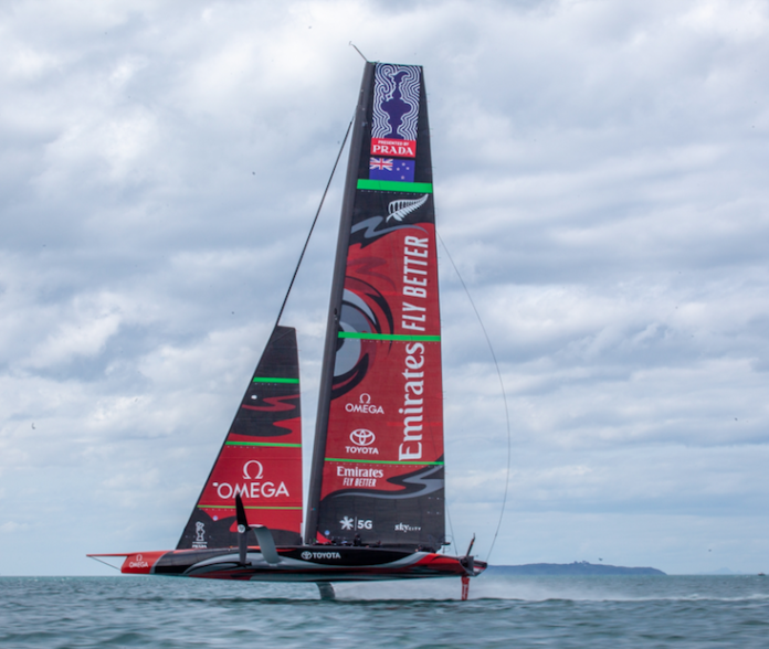 O Emirates Team New Zealand colocou, neste fim de semana, o barco na água no porto de Waitemata para uma sessão de treinamento antecipada.