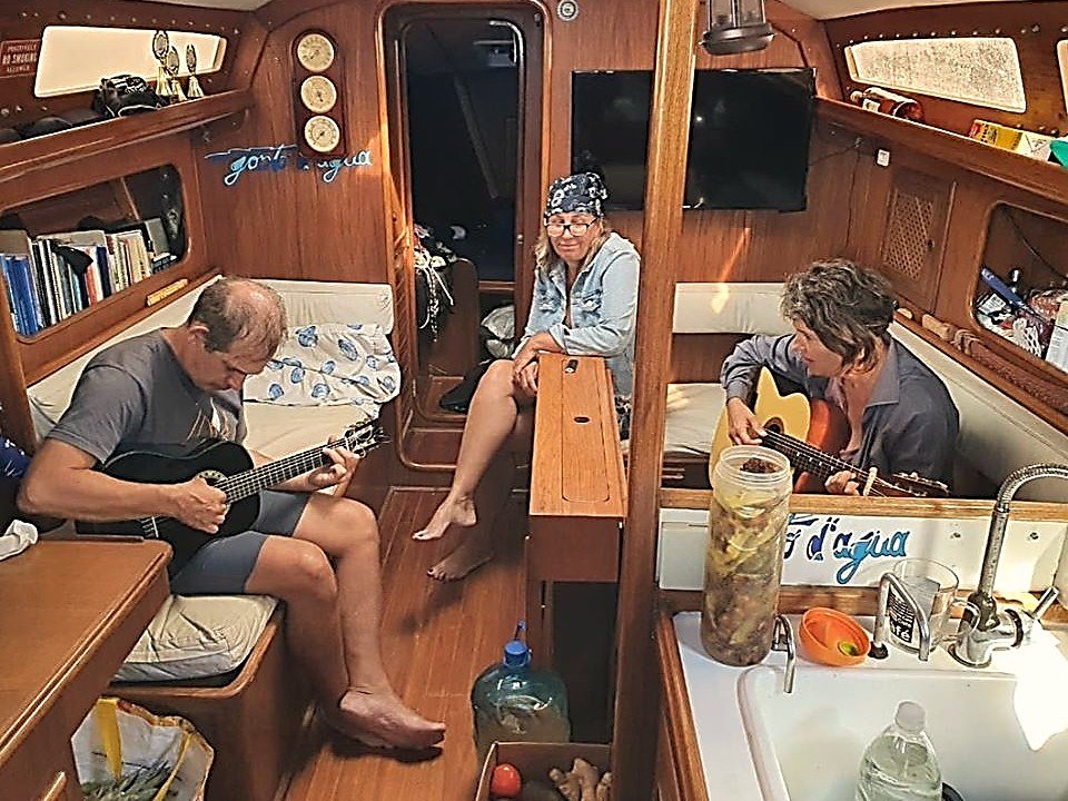 Tem dois violões no veleiro e música rola o dia inteiro. Só Cibele não se arriscou a aprender tocar. Os demais estão empolgados. E eu vou dando as minhas aulinhas. Passamos o dia todo dentro do barco tocando violão, comendo e bebericando vinho.