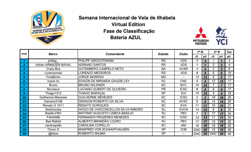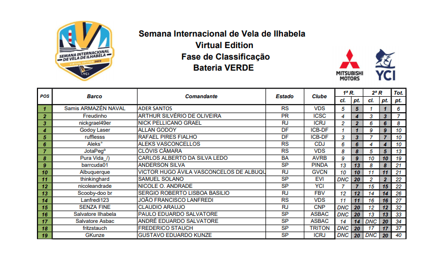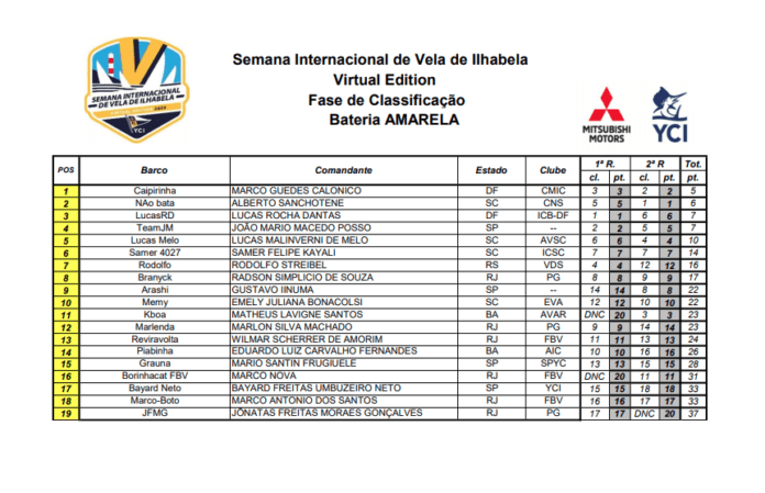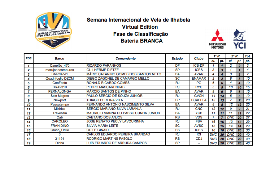 Vela Súmulas das primeiras regatas da Semana de Vela de Ilhabela Virtual Por Adilson Pacheco - 29 de julho de 2020 0 766 FacebookTwitterPinterestWhatsApp Veja as súmulas resultado bateria verde 2 regatas resultado bateria amarelo 2 regatas resultado bateria azul 2 regatas resultado bateria branca 2 regatas