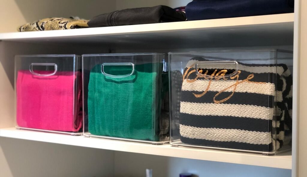A caixas organizadoras transparentes são muitos versáteis, pois podem acomodar carteiras e bolsas menores, blusas de lã, e algumas pessoas também utilizam para organizar a dispensa. Na Home Organizer ABC têm versões disponíveis a partir de R$ 25,85.