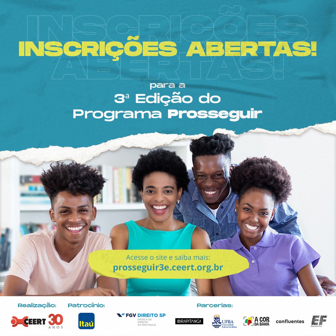 Estão abertas as inscrições para o processo seletivo da terceira edição do Programa Prosseguir, até o dia 6 de dezembro. Idealizado pelo CEERT, o Programa ocorrerá de fevereiro a dezembro de 2021 e pretende desenvolver futuras lideranças negras, apoiando universitários de baixa renda, por meio de estratégias de fortalecimento e permanência acadêmica, além de promover o ingresso qualificado no mundo do trabalho.   Serão 60 bolsas no valor de R$ 600, além de um curso extracurricular, com enfoque em liderança, preparação para o trabalho, equidade racial e inglês, para estudantes negras e negros já matriculados na modalidade presencial de cursos de graduação e residentes nas regiões metropolitanas São Paulo (SP), Salvador (BA) e Rio de Janeiro (RJ). O resultado final será divulgado em fevereiro.