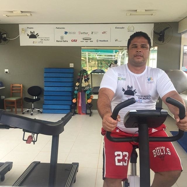 A academia montada no Instituto Ingo Hoffmann tem infraestrutura com esteiras, bicicletas ergométricas, halteres e bola de pilates para os pais, além de profissional que acompanha e instrui as atividades.