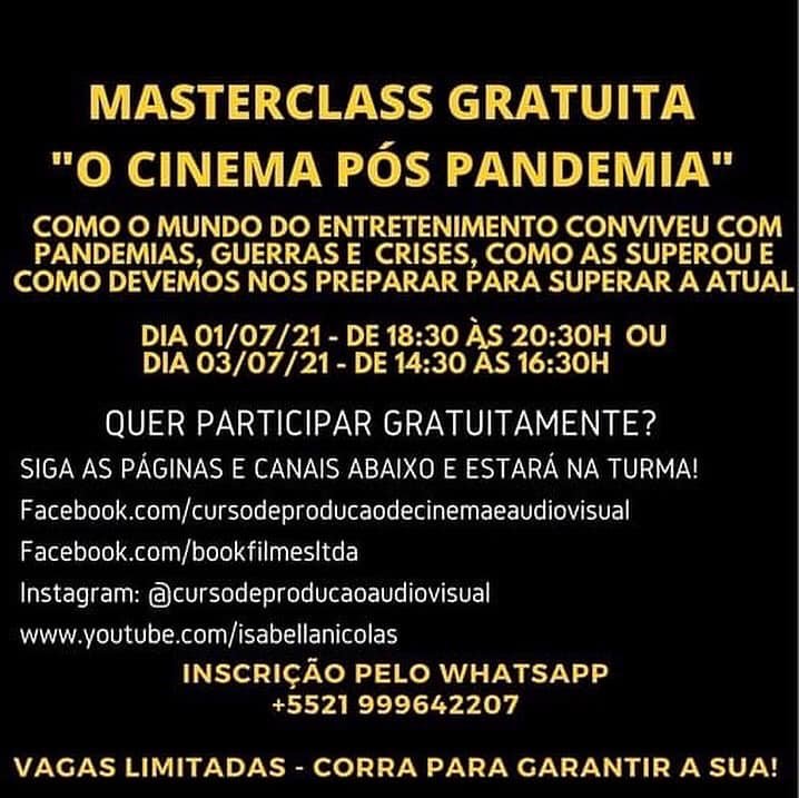 Nesta quinta, 01 de julho, última oportunidade de participar da MASTERCLASS GRATUITA mais procurada da Book Filmes. Nessa aula master, veremos um pouco da história do cinema, as interrupções ocasionadas por pandemias, guerras e crises econômicas e como a indústria soube se reinventar para se reerguer.