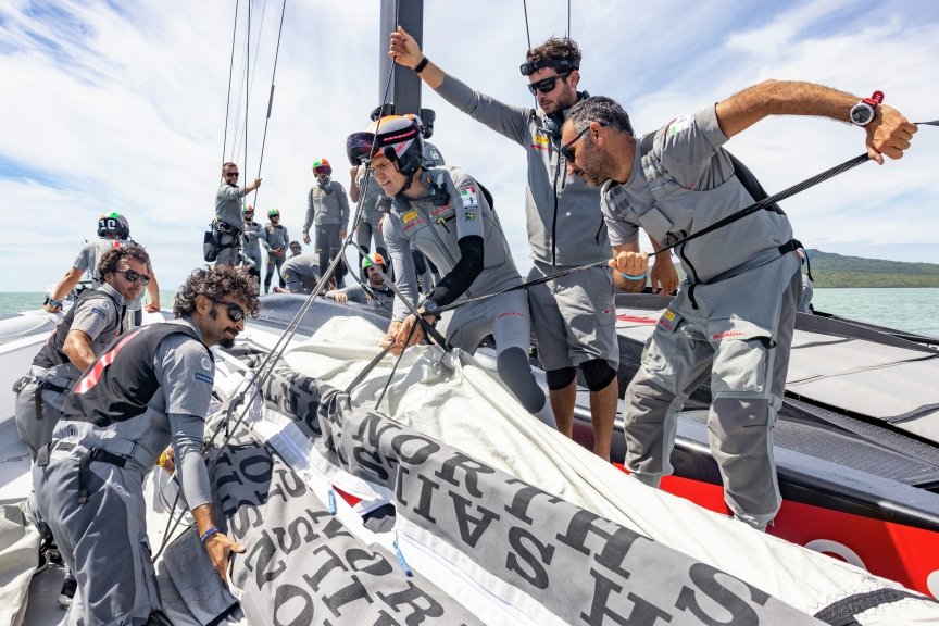 A equipe de terra : Uma equipa de 50 pessoas que cuida do AC75 “Luna Rossa”.