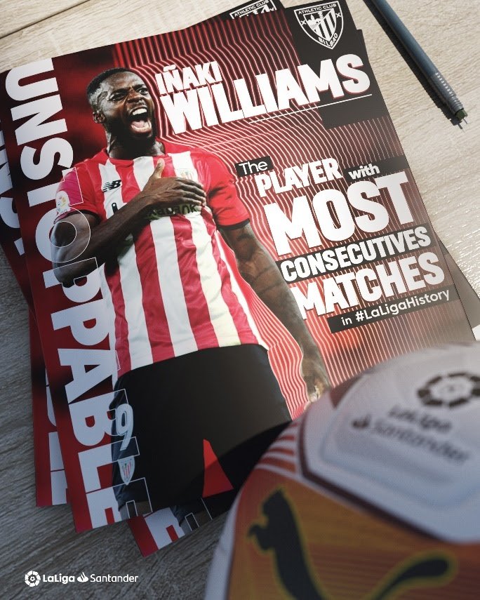 Quando entrar em campo sábado (2), às 16h (Horário de Brasília), para jogar contra o Alavés pela oitava rodada de LaLiga Santander, o atacante Iñaki Williams, do Athletic Club fará algo histórico e, para muitos, inimaginável no futebol atual: o atleta, de 27 anos quebrará o recorde de jogos consecutivos em LaLiga.