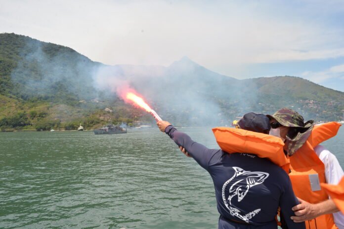 sinalização com pirotécnicos, transmissão de “Securitée” e “May Day”, demonstração de resgate de náufrago por aeronave.