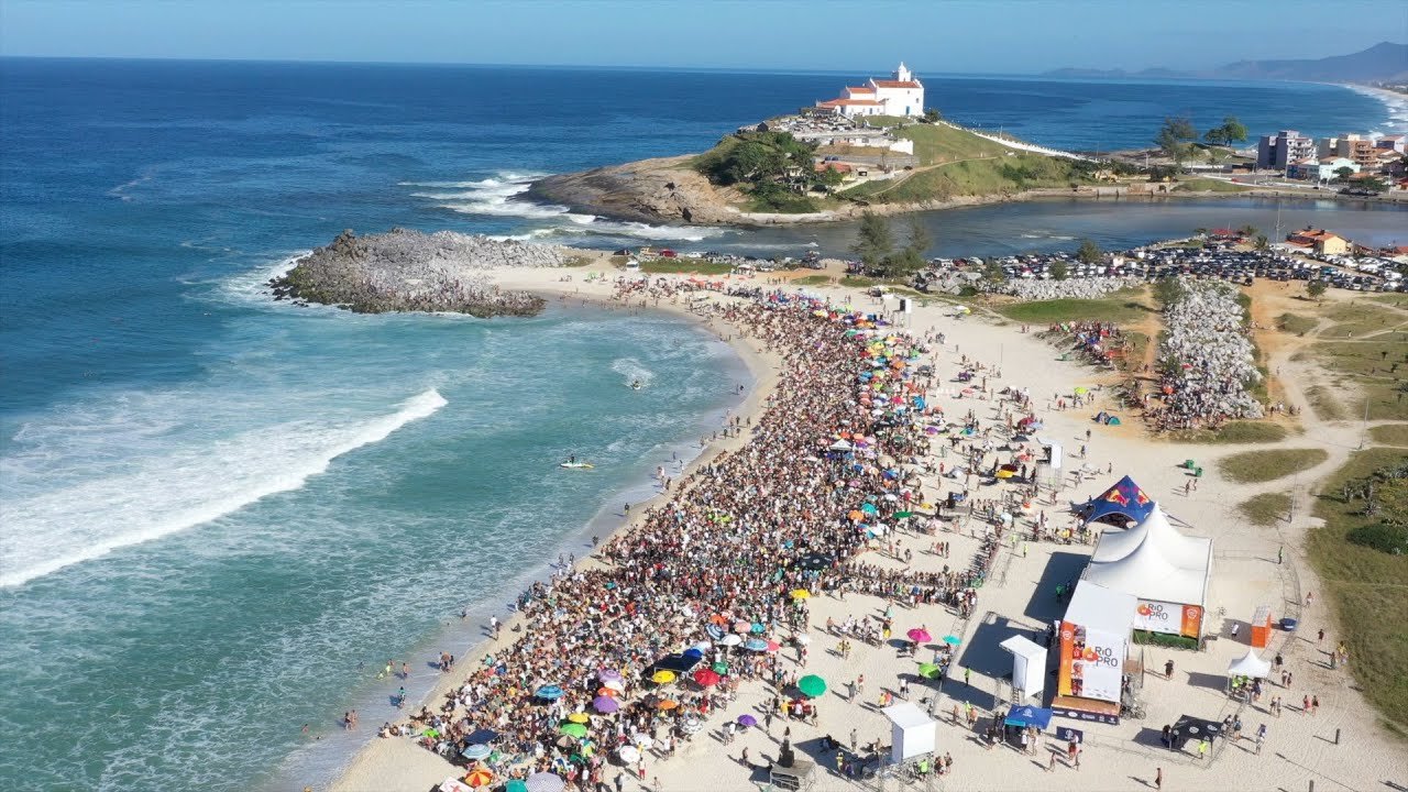 (A praia de Itaúna, em Saquarema, durante o último campeonato da WSL na cidade – foto Daniel Smorigo / World Surf League)