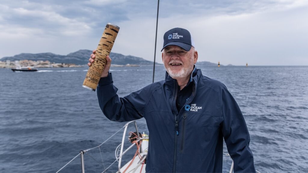 UN Secretary-General’s Special Envoy for the Ocean Peter Thomson with the baton onboard Ambersail-2