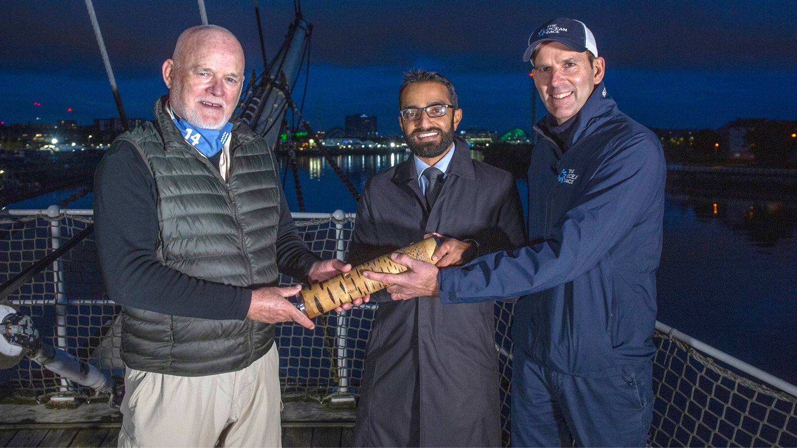 Race4Nature - Baton Relay - COP 26 UN Special Envoy for the Oceans, Peter Thomson, and Vel Gnanendran, Director for Climate and Environment, Foreign Commonwealth and Development Office, with the Relay4Nature Baton onboard the Tall Ship Glenlee. The baton arrived in Glasgow, Scotland, for COP26. © Marc Turner / The Ocean Race