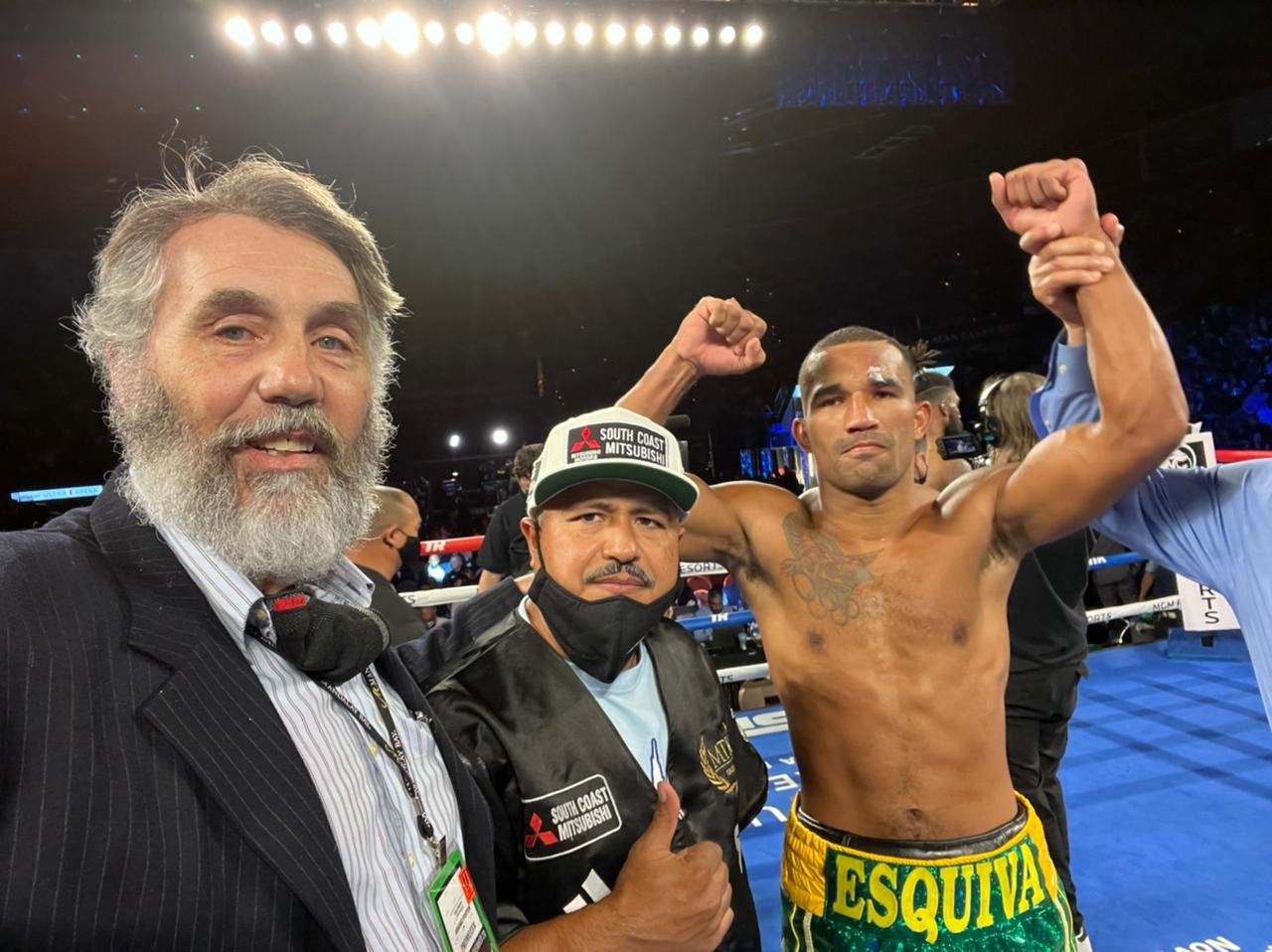 Feliz pelo desempenho e principalmente pela preparação em Riverside para a luta, Sergio Batarelli, que cuida da carreira de Esquiva Falcão há oito anos, comemorou o resultado no Mandalay Bay.