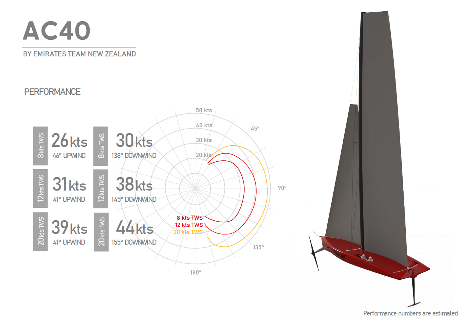 Em ventos fracos, o AC40 deverá ser capaz de navegar até 26 nós a 46º a favor do vento e 30 nós de velocidade do barco a 138º a favor do vento.