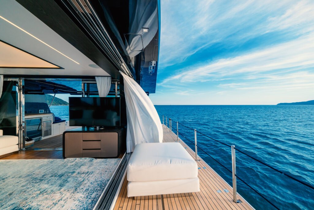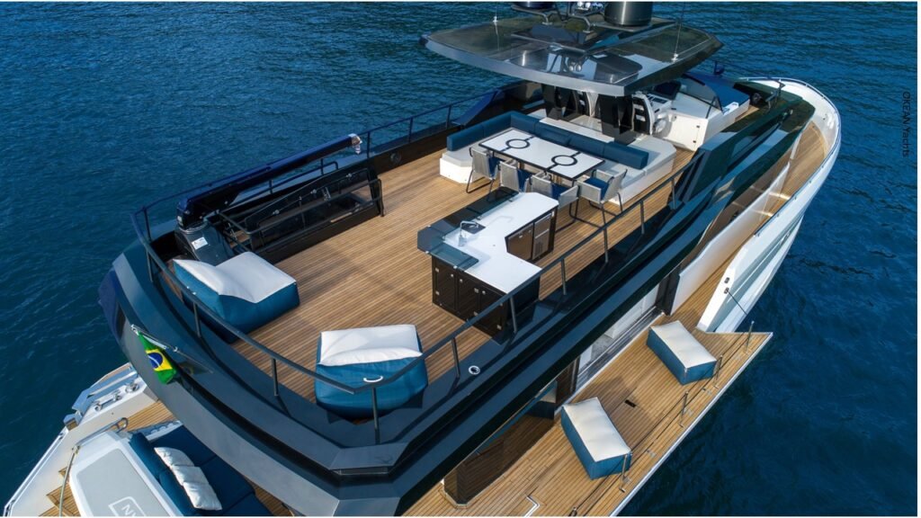 Ao todo, são 136m² de áreas externas ao ar livre, incluindo o flybridge (terceiro pavimento) que é um verdadeiro terraço sobre os mares. Esse ambiente é equipado com áreas de relaxamento, banhos de sol, bar e segundo posto de comando. Já na proa (parte frontal) está o lounge que pode ser usado como uma sala de estar privativa ao ar livre. Já a plataforma de popa merece atenção especial já que pode ser baixada, formando um Beach Club sobre as águas, ou ainda utilizada como garagem que comporta uma moto aquática e um bote inflável de apoio.