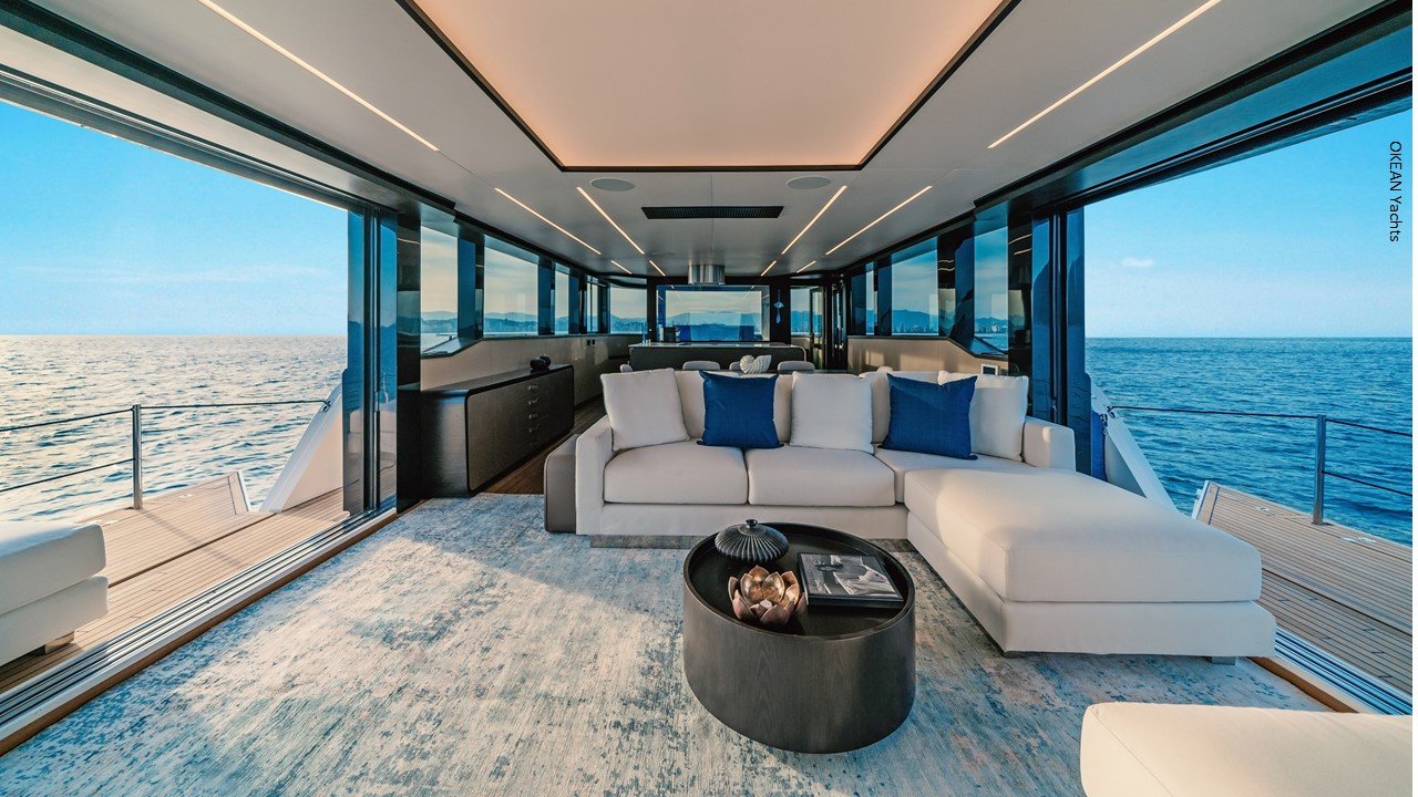 Outra característica inconfundível OKEAN Yachts que pode ser vista à distância são as paredes envidraçadas que contornam o deck principal e permitem uma visão 360° do oceano. Um elemento que pode ser fechado, para um ambiente mais intimista, ou totalmente aberto, para o maior contato com a navegação. Assim como os bordos laterais que podem ser completamente abertos, ampliando a área de cockpit e criando grandes varandas suspensas sobre os mares que trazem a natureza para dentro da embarcação.