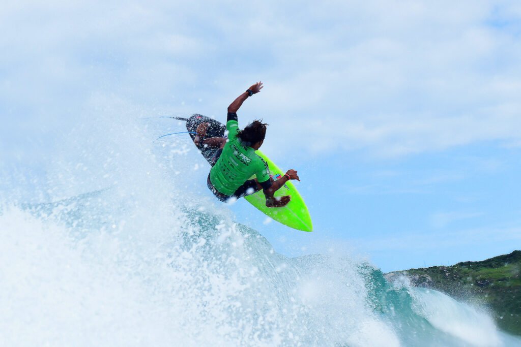 NOVOS RECORDES – Antes das meninas competirem na sexta-feira, os homens comandaram o show nas ondas da Praia Mole, registrando novos recordes na história do LayBack Pro em Florianópolis. O cearense Michael Rodrigues aumentou seu próprio recorde de pontos do ano passado, de 16,30 para 16,33. Ele igualou a nota 9,00, que foi a maior de 2021, com um aéreo “full rotation stalefish” incrível de frontside, colocando a mão de trás na borda da prancha.