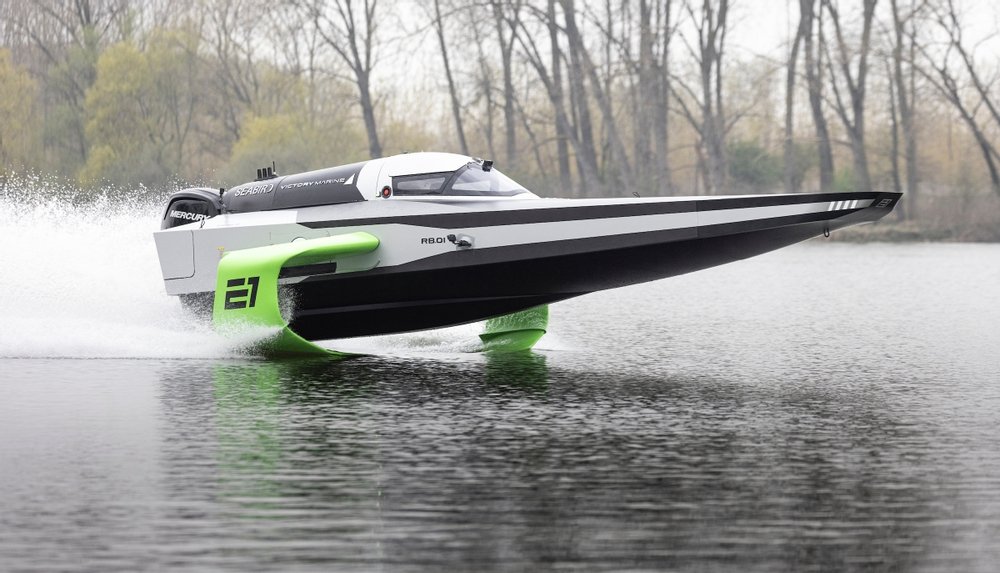 O RaceBird é alimentado por uma bateria Kreisel de 150 kW e um motor de popa produzido pela Mercury Racing, com o barco subindo rapidamente em suas lâminas com o benefício de torque e aceleração instantâneos.