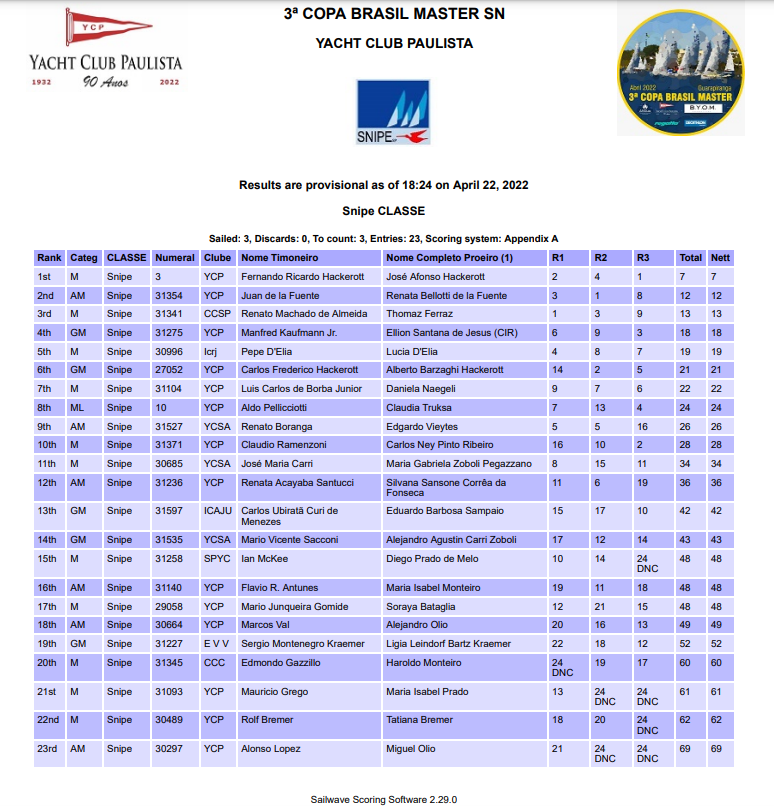 Os masters na Snipe foram Fernando Hackerott e José Hackerott, seguidos por Juan de la Fuente e Renata Bellotti, e Renato Machado de Almeida e Thomaz Ferraz. Na ILCA 6, o campeão foi Carlos Wanderley e na ILCS 7, o ganhador foi Ian McKee.