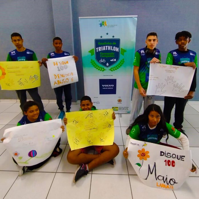 “Nossos alunos fizeram alguns cartazes sobre o que achavam mais importante a respeito do maio laranja. Ilustraram com desenhos, colocaram frases e os números para denúncia de abusos”, explicou o professor Rodrigo Rodrigues, do núcleo Cajuru da Escolinha de Triathlon, em Curitiba, Paraná.