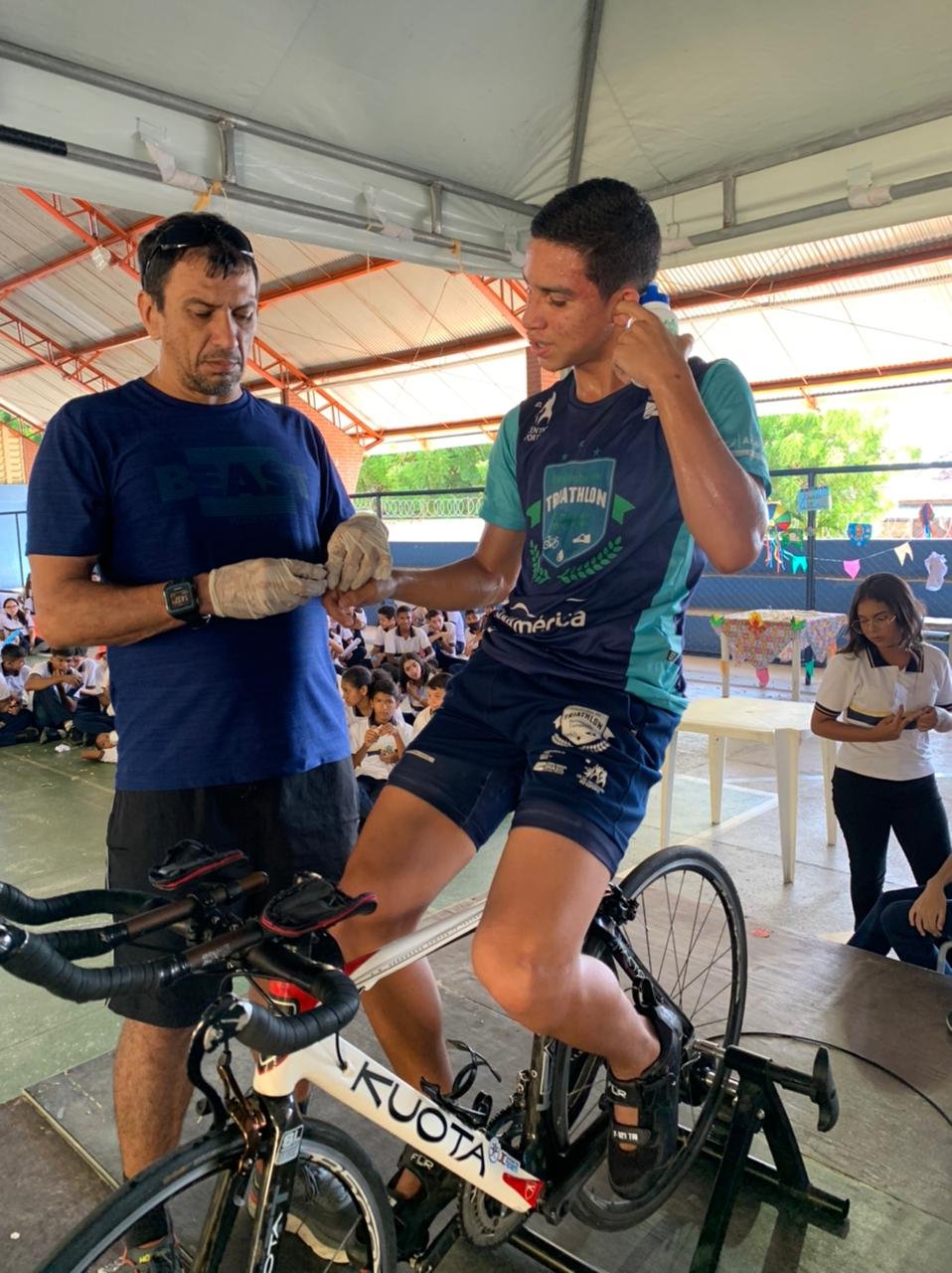 O aluno da Escolinha de Triathlon escolhido para a demonstração foi Francisco Cauã Francelino de Oliveira. Um dos destaques do projeto em Aquiraz, foi o 16º colocado na primeira etapa do Campeonato Cearense de Triathlon Olímpico, em abril. “O Cauã é muito disciplinado e tem um grande potencial para o triathlon. Seu ciclismo é ótimo, e foi ideal para a Feira de Ciências”, analisou Rivaldo Sena.