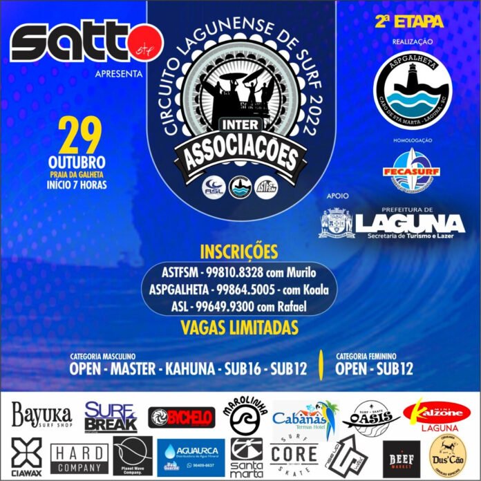 Uma cidade histórica fazendo história no esporte, depois do Festival Náutico – a cidade de Laguna, região sul de Santa Catarina recebe o 2º Etapa Circuito Municipal de Surf Inter Associações no dia 29 de outubro, na Praia da Galheta. O evento conta com apoio da Secretaria de Turismo e Lazer da Prefeitura Municipal de Laguna, das associações de surf de Laguna .