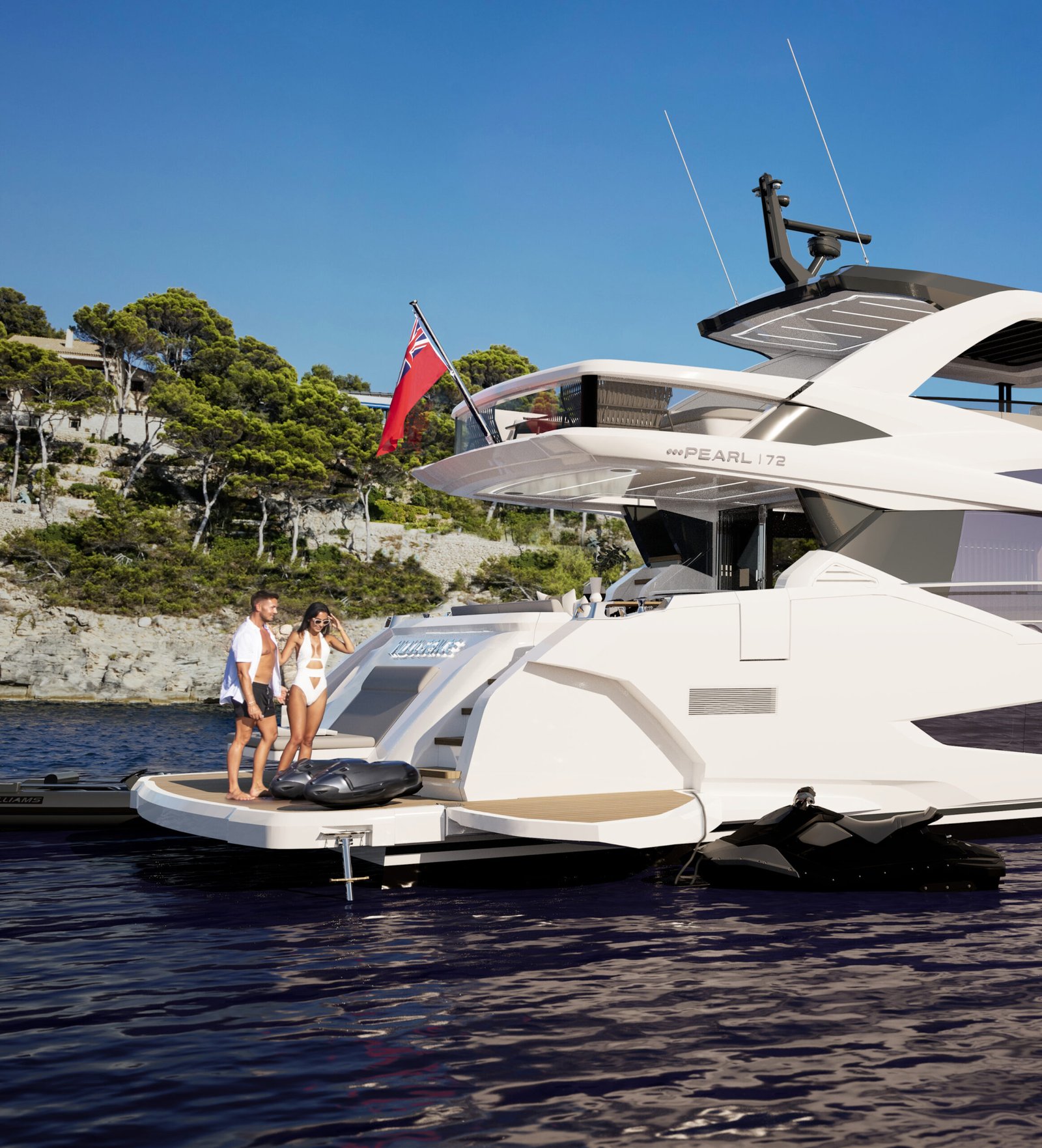Cabins. One is forward with a private entrance, as typically seen on much larger yachts, and the second is full beam amidships. In addition to providing an ideal solution for co-owners who enjoy the yacht together, the innovative layout allows owners to enjoy a beautiful view even when moored stern-to in a marina. There are two further en-suite double cabins plus accommodation for the crew, in addition to an exceptional garage with space for a William 345 tender (or similar) and a jet ski. Fold down balconies at water level also create a beach club for those who enjoy spending time on or close to the water.