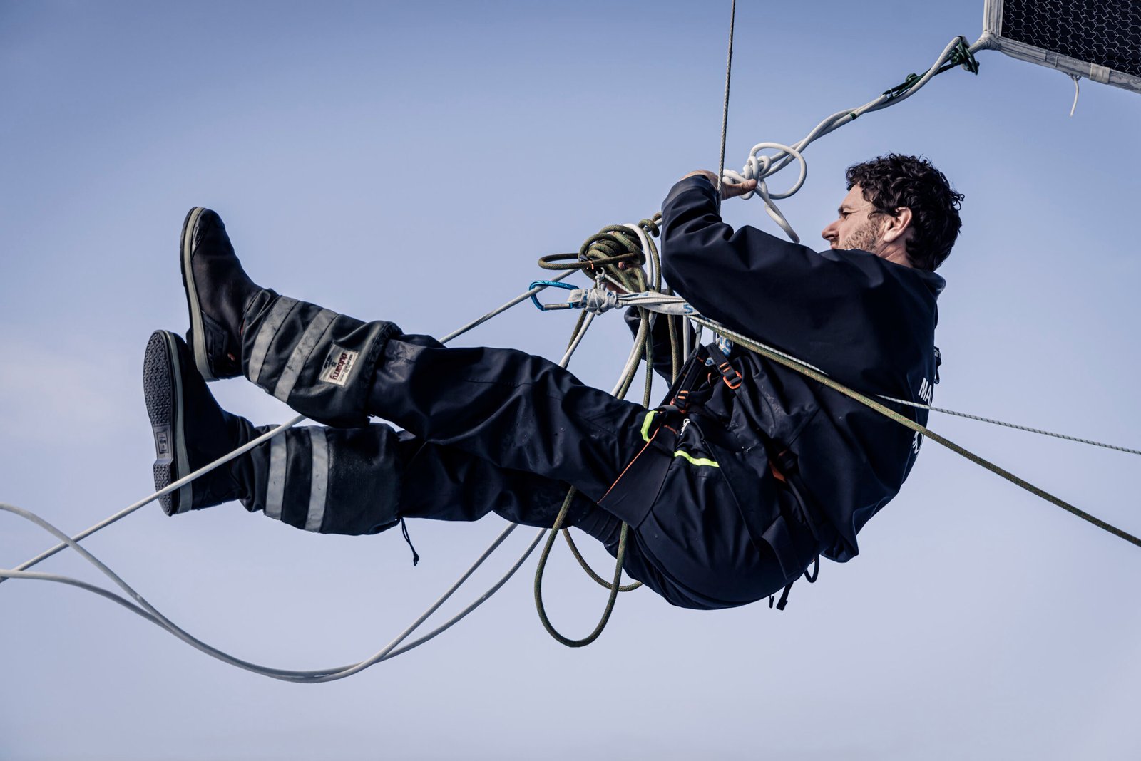 8 February 2023, Leg 2, Day 15 onboard Biotherm. Anthony Marchand cleaning the lazy sheet mess,