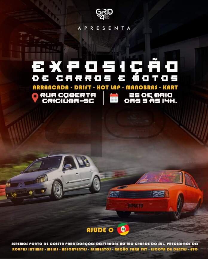 A Associação Sul Catarinense de Esporte Motor – GRID48 será lançada oficialmente amanhã (25), na Rua Coberta (Giro Henrique Lodetti), em Criciúma, das 09 às 14h. Teremos carros e motos de competição, junto com a campanha “Ajude o RS”, onde as pessoas podem levar donativos como: absorventes, escovas de dente, meias, ração para pet e roupas íntimas.