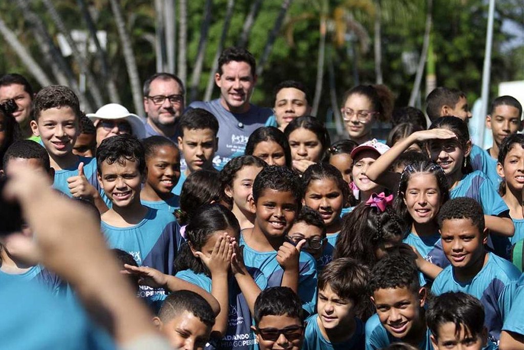 Os alunos receberam novos materiais do projeto Nadando com Thiago Pereira das mãos do próprio atleta, como toucas, óculos, uniformes e livros. Iniciado em agosto de 2022, o Nadando com Thiago Pereira atende 360 pessoas em 20 turmas e é 100% gratuito.