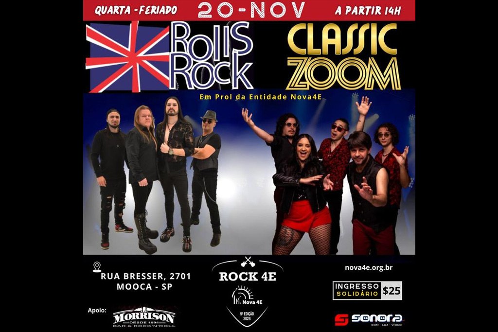 Atração para os fãs de rock nesta quarta-feira (20), feriado da Consciência Negra (20) da cidade de São Paulo: as bandas Rolls Rock, Classic Zoom e Play2day se apresentam na 9ª edição do show Rock 4E, na sede da Nova 4E (Entidade Especializada em Pessoas Especiais) no bairro da Mooca (SP), a partir das duas horas da tarde.