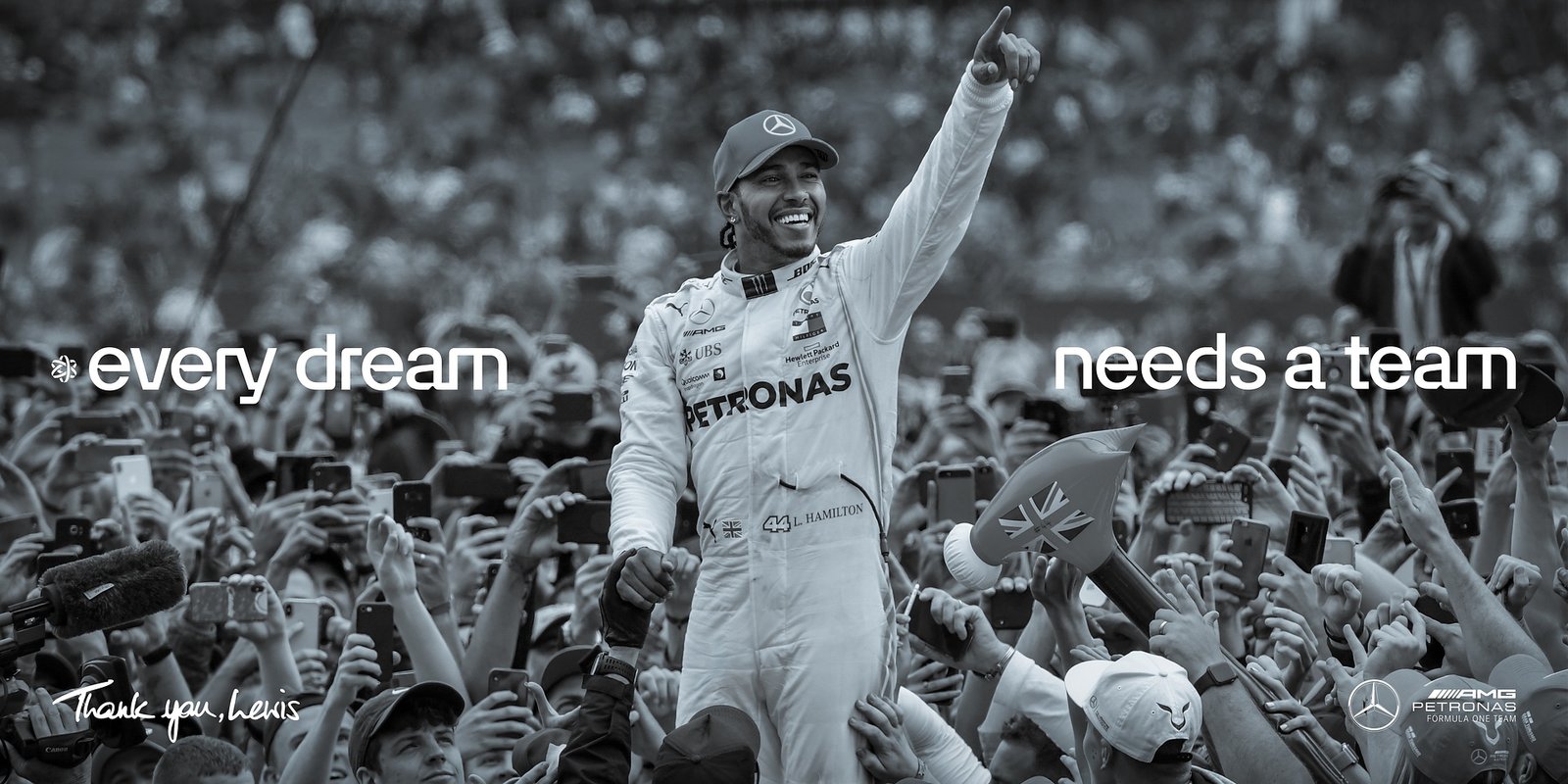 O filme é apenas o ponto de partida para as homenagens da equipe a Lewis e suas conquistas. Uma campanha ao ar livre com fotografias icônicas (anexas) de Lewis e da Equipe Mercedes-AMG PETRONAS F1 iluminará marcos em Kuala Lumpur, no Reino Unido e nos EUA, incluindo locais como a Times Square. Durante o fim de semana da corrida em Abu Dhabi, Hamilton carregará a mensagem da campanha em seu carro, destacada com os nomes de 150 fãs, representando os milhões de seguidores leais que fizeram parte da incrível jornada.
