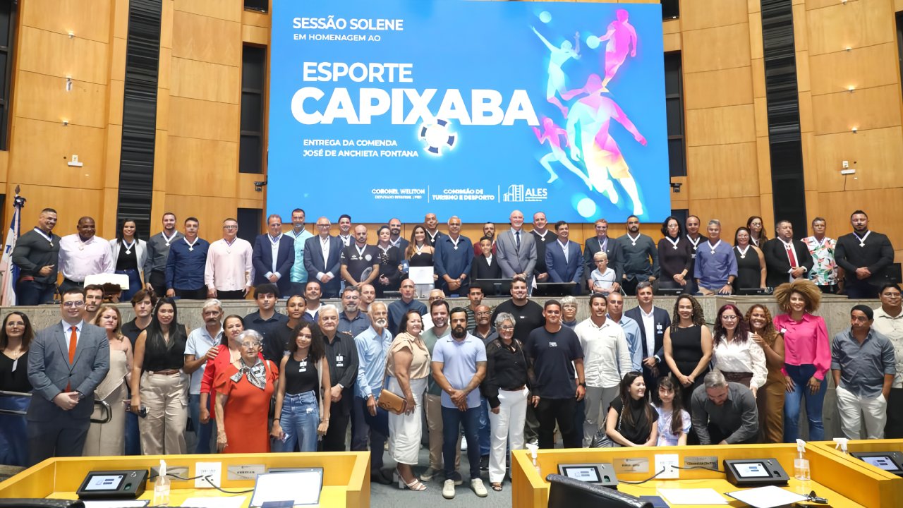 A sessão solene da Assembleia Legislativa reuniu atletas, professores e gestores da área esportiva. Capixaba, que se recupera de cirurgia nos ombros, esteve entre os homenageados